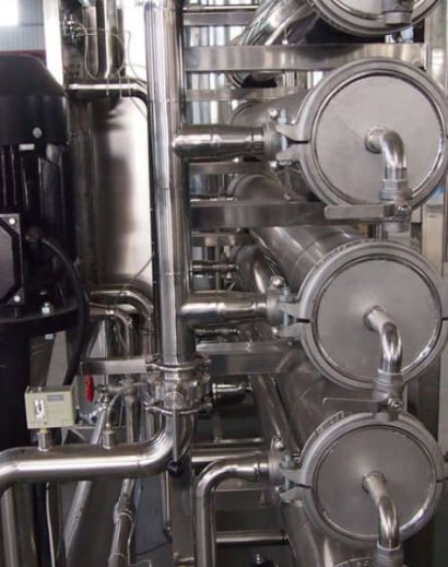 It is mainly composed of the following equipments:pre-treatment system (water tank,multi-medium filter, active carbon filter, ion exchanger, millipore filter), membrane separation system (ultra filter, nanometer filter, RO system), electrodialysis device, sterilization system (UV device, ozone device) ,product water tank and so on.